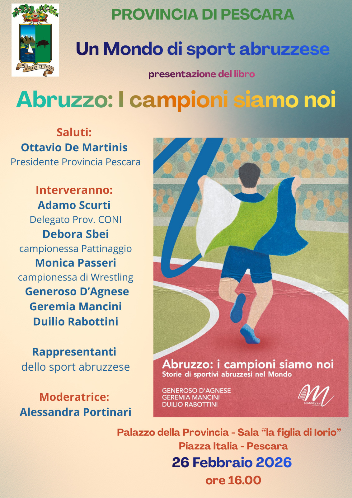 L’iniziativa, ospitata nella sala “La Figlia di Iorio” del Palazzo della Provincia e patrocinata dalla Provincia di Pescara, ruota attorno al lavoro degli autori Generoso D'Agnese, Geremia Mancini e Duilio Rabottini, che hanno raccolto le vicende di atleti capaci di partire dalle radici abruzzesi per affermarsi sui palcoscenici internazionali.